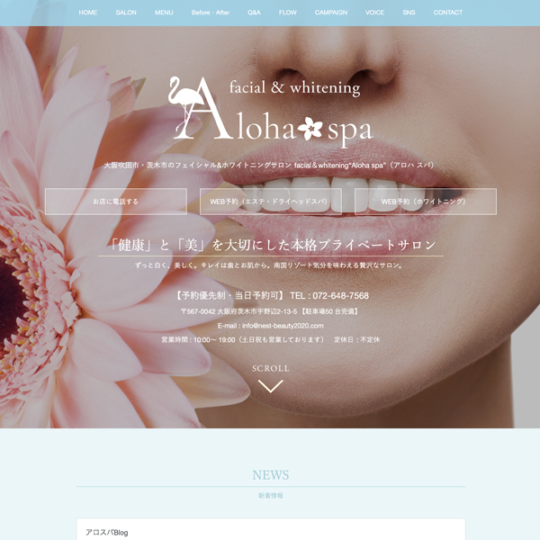 大阪のフェイシャルエステ&ホワイトニングサロン様からのご依頼でHPを制作させて頂きました。「健康」と「美」を大切にした本格プライベートサロン。ずっと白く、美しく。キレイは歯とお肌から。南国リゾート気分を味わえる贅沢なサロンということで、海をイメージしたブルー系のデザインにまとめています。