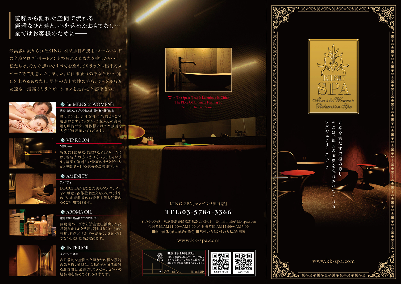 渋谷区のリラクゼーションSPA『KING SPA』様のA4三つ折りリーフレット。HPや内装撮影と合わせてご依頼頂きました。黒をベースに非日常感溢れるサロンの雰囲気を、撮影画像をふんだんに使うことで表現。高級感と独特な雰囲気を演出。チラシ配布などとの併用で新規顧客400人以上・推定黒字350万円以上の業績をご報告頂きました。