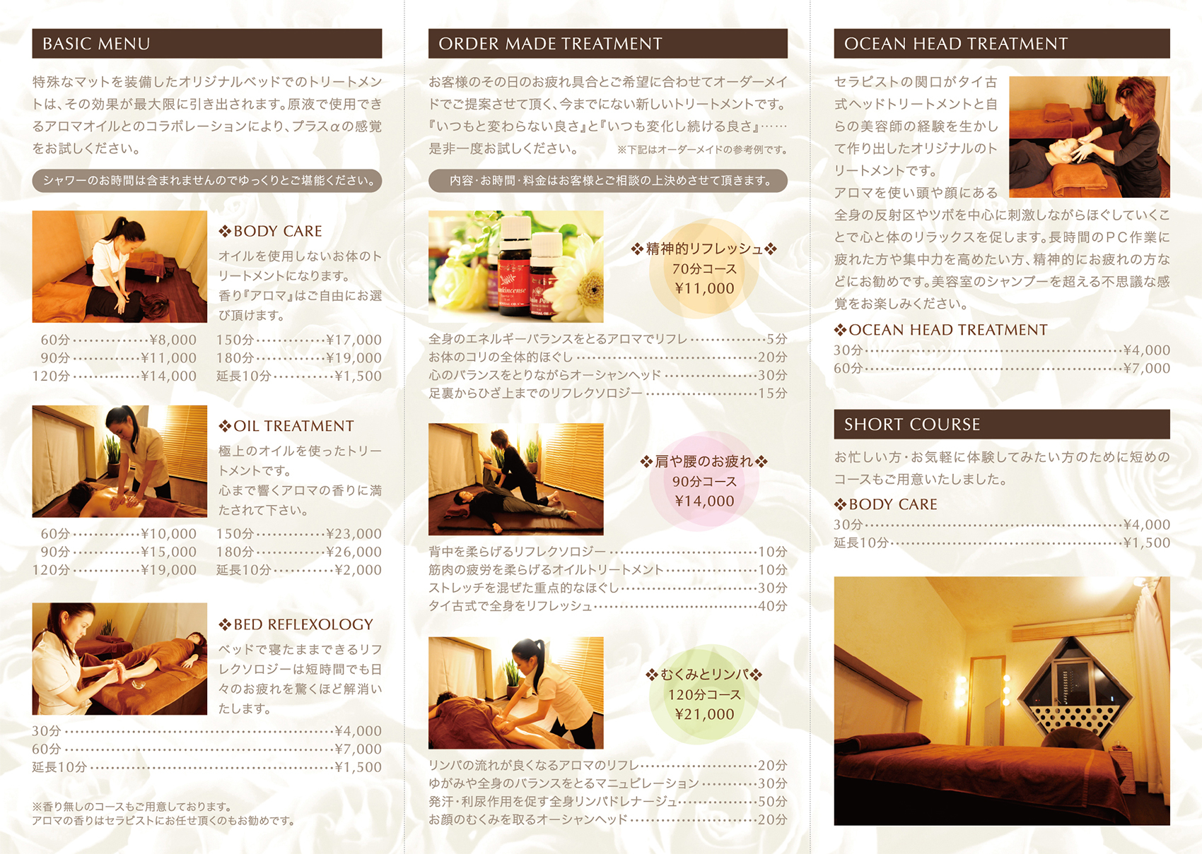 前へ INDEX 次へ 表面 中面 麻布のリラクゼーションサロン『Ocean Leaf』様のB5三つ折りリーフレット。独自の技術をしっかり伝えたいとのリクエストで、施術シーンと内装撮影を合わせてご依頼頂きました。PP加工を使うことで高級感も演出しています。 ■サイズ:B5(天地182×左右257mm)■表紙サイズ:天地182×左右87mm■紙質:マット110kg■色数:両面カラー■加工:巻き三つ折り■加工:表面にツヤPP加工(ツヤと高級感が出て耐久性が増します)■ロゴ:クライアント様よりご支給■内装写真:グロリアデザインにて撮影■施術写真:グロリアデザインにて撮影■文字:クライアント様よりご支給頂いたものをグロリアデザインにて編集 PP加工 (薄いフィルムで表面をコーティング) 前へ INDEX 次へ 制作事例一覧 ホームページ 仮サイト 写真撮影 リーフレット(折りパンフレット) チラシ(フライヤー) DM・ポストカード ロゴデザイン メンバーカードなど 名刺 チケット・クーポンなど 看板・ポスター・タペストリー その他のデザイン