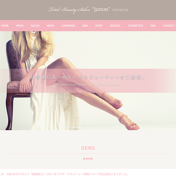 作成させて頂きましたjunon田向店様のHPをベースに作成させて頂きました。内容については田向店とほぼ同様、HIFUを中心としたエステメニューやまつげエクステなどをご提供されれています。